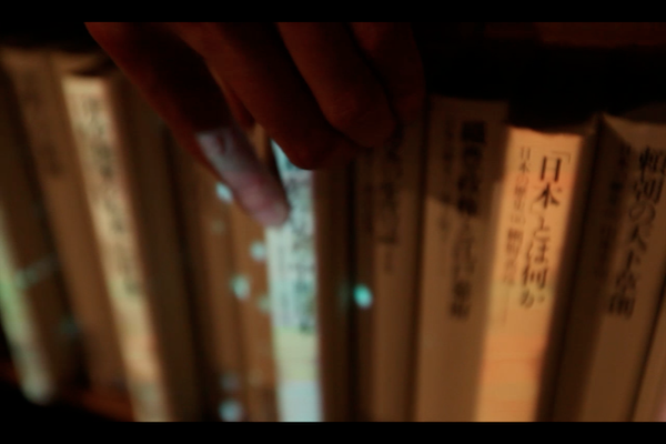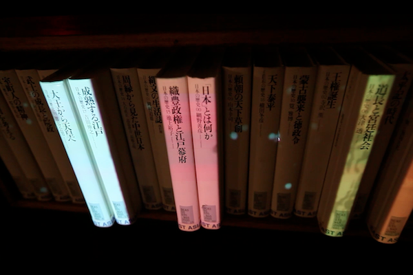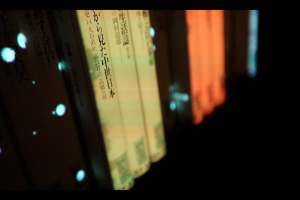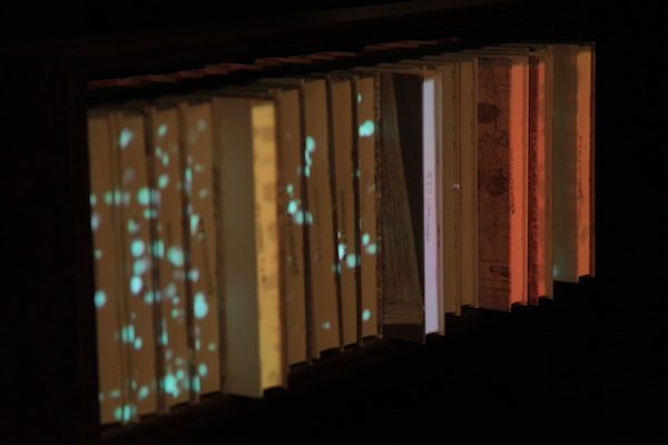 An illuminated bookshelf invites user interaction. When a book is moved, its binding is highlighted and an animation is triggered causing white orbs to appear and bounce off the walls. A ripple animation is generated whenever an orb bounces. The orbs only react to active books, and books are grouped according to color palette.