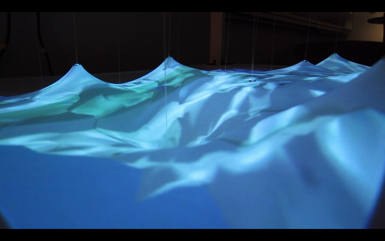 An experiment in spatial topology. A map of Boston is projected over a spandex surface. Peaks and valleys on the map change in real time based on concentrations of Twitter usage in an area. The motors underneath the projection deform the screen to reflect a spatial demonstration of these changes in Twitter usage density.